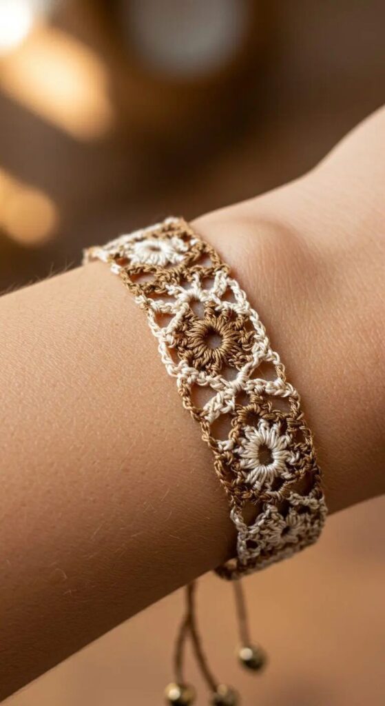 Si eres amante del crochet y te encanta lucir accesorios hechos a mano, este tutorial es perfecto para ti. Hoy aprenderás a tejer una hermosa pulsera de crochet estilo boho con un diseño delicado de flores que combina dos colores y un cierre ajustable con cuentas decorativas. Es una manualidad sencilla, económica y perfecta para regalar o vender.