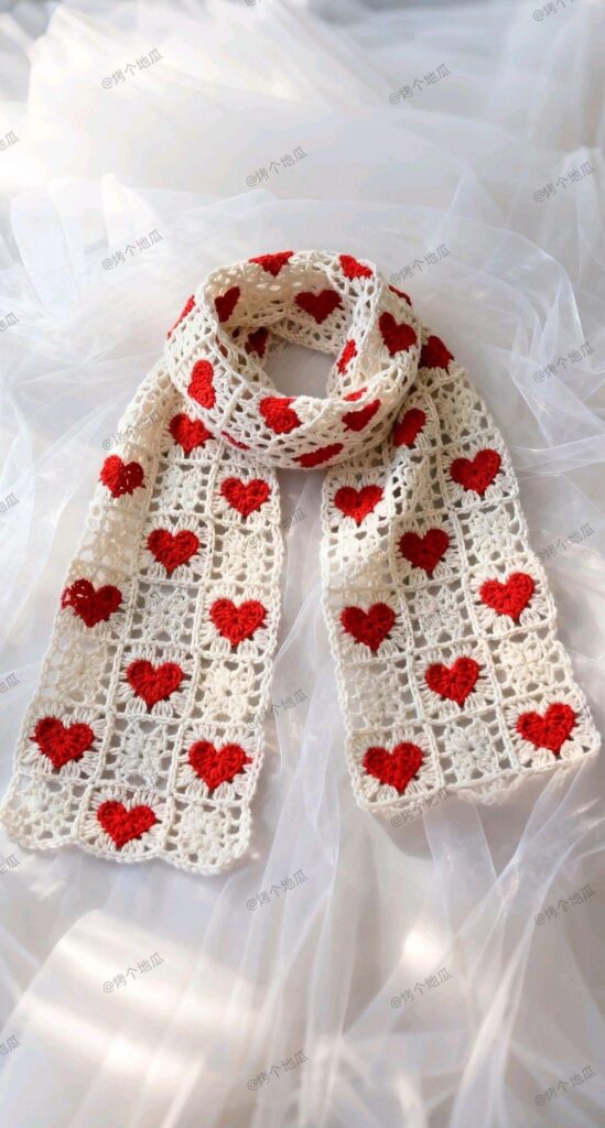 🧵 Características del diseño Esta bufanda está tejida en base a cuadros de crochet con corazones en el centro, lo que le da un estilo moderno y estructurado. Cada corazón está cuidadosamente integrado en el tejido, creando un patrón repetitivo que destaca sobre el fondo blanco. ¡Una combinación que transmite ternura y elegancia!
