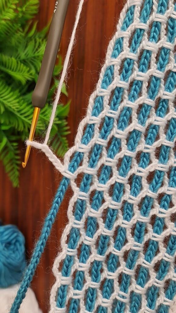 Este diseño combina hilos en tonos blanco y azul para crear un efecto visual tipo waffle o panal, ¡perfecto para quienes aman los detalles! Además, les mostraré cómo hacer el cambio de color limpio y sin nudos visibles, para que su trabajo luzca profesional desde el primer punto.